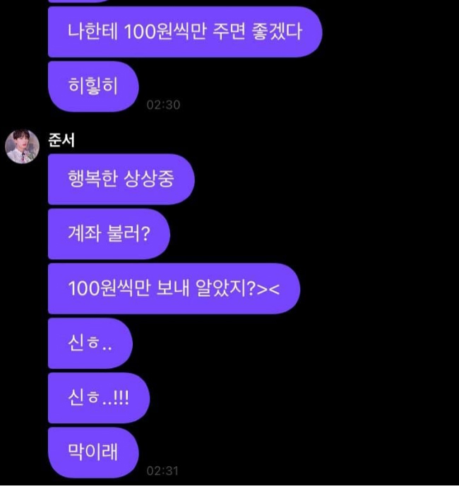 계좌불러? 신..ㅎ... 신ㅎ..! 막이래" 라는 준서.