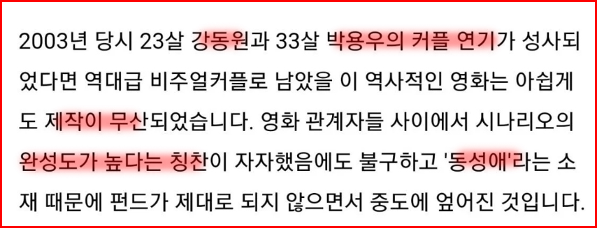 동성애 소재 때문에 펀드가 제대로 안되서 중간에 엎어진것.....