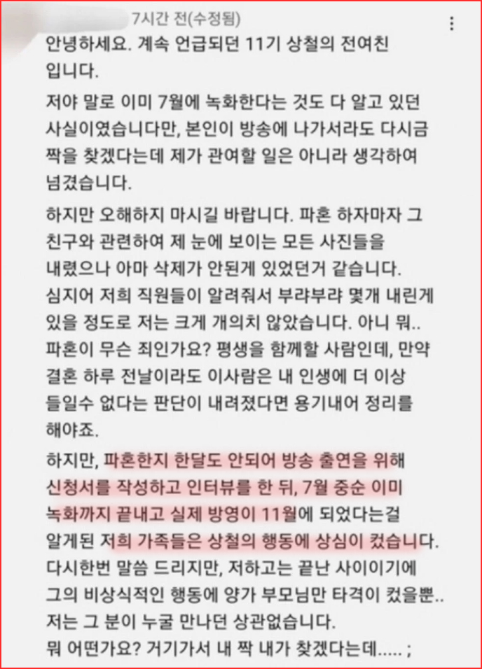 상철의 글을 정리해볼게요. 파혼후 정리를 했으나